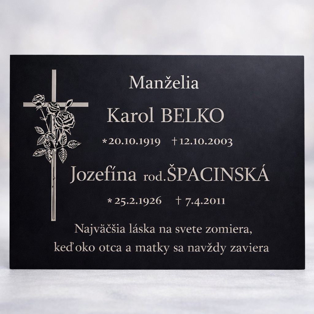Elegantná a dôstojná pamätná tabuľka, ktorá uchová spomienku na Vašich blízkych. Vyrobená z kvalitného Dibond® materiálu – hliníkového sendvičového panelu s extrémnou trvácnosťou, odolného voči dažďu, mrazu aj UV žiareniu.