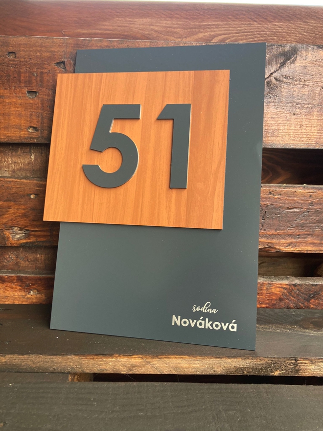 Farba popisného čísla je: podklad -antracit/farba podkladu na číslice - imitácia dreva. Vy si vyberáte farbu číslic.