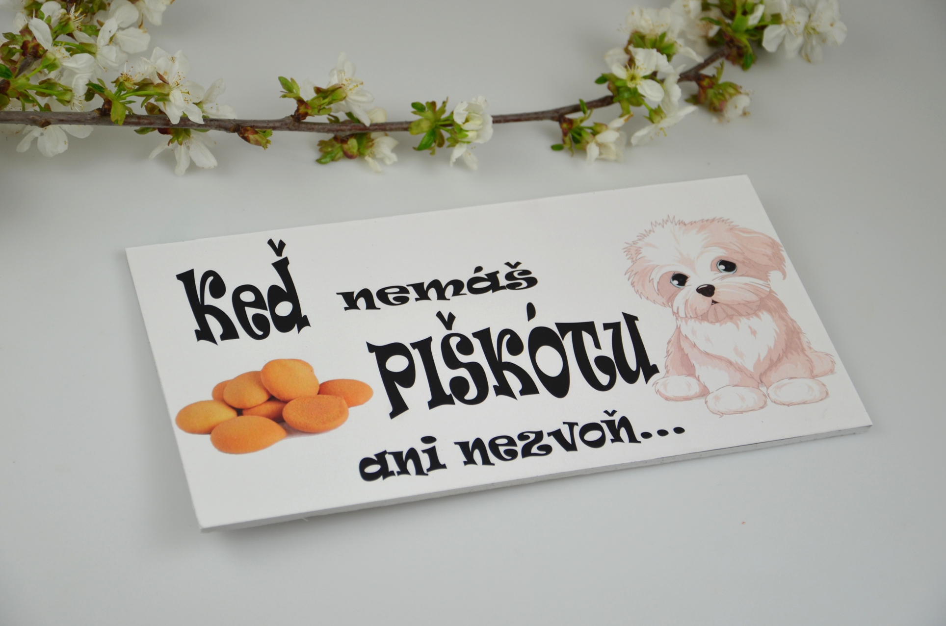 Tabuľka „Bez piškóty ani nechoď“ – originálna tabuľka na dvere pre milovníkov psíkov